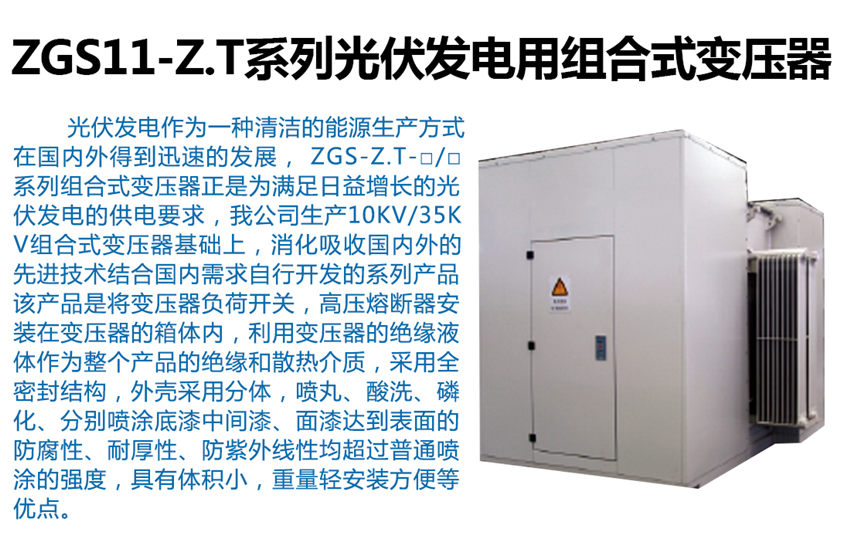 ZGS-Z.T-□/□系列組合式變壓器是消化吸收內外的先進技術結合內需求自行開發(fā)的系列產品,該產品是將變壓器,負荷開關,高壓熔斷器安裝在變壓器的箱體內,利用變壓器的絕緣液體作為整個產品的絕緣和散熱介質,采用全密封結構,外殼采用分體,噴丸、酸洗、磷化、分別噴涂底漆、中間漆、面漆達到表面的防腐性、耐厚性、防紫外線性均超過普通噴涂的強度,具有體積小,重量輕、安裝方便等優(yōu)點。