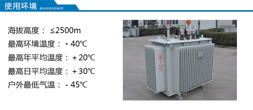 此類產(chǎn)品適用于交流50(60)Hz,可在戶內(nèi)(外)使用,容量在315kVA 及以下時可安裝在桿上,環(huán)境溫度不高于40℃,不低于-25℃,最高日平均溫度30℃,最高年平均溫度20℃,相對濕度不超過90%(環(huán)境溫度25℃),海拔高度不超過1000m。
